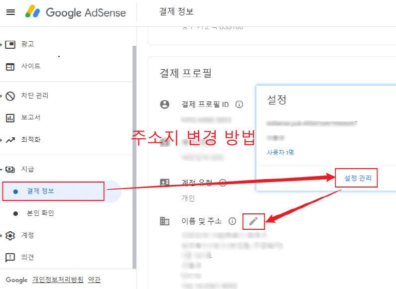 구 주소지를 기억하고 계신다면 빨리 도착하기 위해서는 표준인 도로명 주소로 입력을 해야 합니다. 도로명 주소변환 홈페이지에서 도로명 주소지로 변환을 합니다. 이후 애드센스 계정으로 로그인한 뒤 지급> 결제정보 > 설정 > 설정 관리 순으로 주소지를 변경할 수 있습니다. ( 우편번호까지 가장 정확히 입력해야 합니다. )