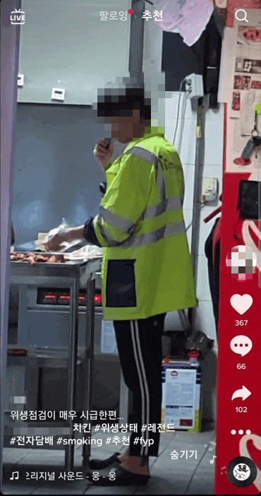 영상 기반 소셜미디어 틱톡에 한 치킨집 직원이 주방에서 전자담배를 피우며 치킨을 조리하는 영상이 올라왔다. 해당 동영상 속에서 위생 논란을 낳고 있는 브랜드는 호식이 두 마리 치킨으로 밝혀졌다. 담배연기가 마치 스모크 치킨을 만드는 것과 같은 착각도 들게 하고 있습니다. GIF 영상 속에는 직원으로 보이는 남성이 위생모와 위생 앞치마, 마스크 또한 착용하지 않은 채 치킨을 주물럭거리다 전자담배를 치킨 위로 내뿜는 모습이 담겼있었습니다.
