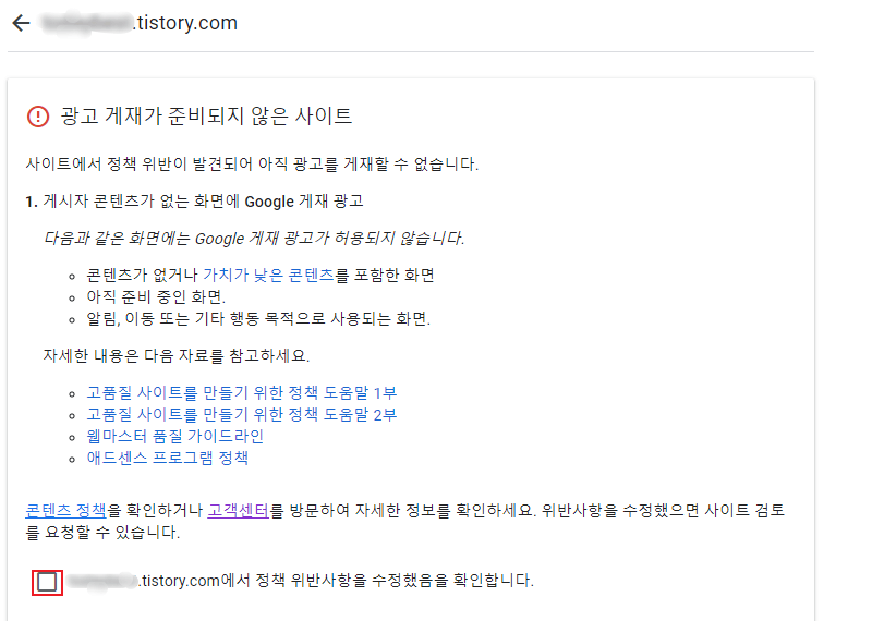 사이트에서 정책 위반이 발견되어 아직 광고를 게재할 수 없습니다. 전체적으로 가치가 낮은 콘텐츠를 포함한 화면이 많다는것 같습니다.